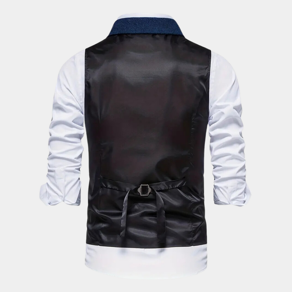 Ware vakmanschap in ambacht. Dit vest is gemaakt van hoogwaardige tweed en is voortreffelijk ontworpen met geribbelde revers en een klassiek visgraatpatroon, afgemaakt met een enkele borstzak voor gemakkelijke opberging.