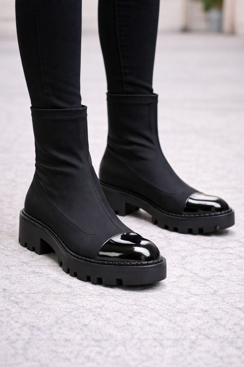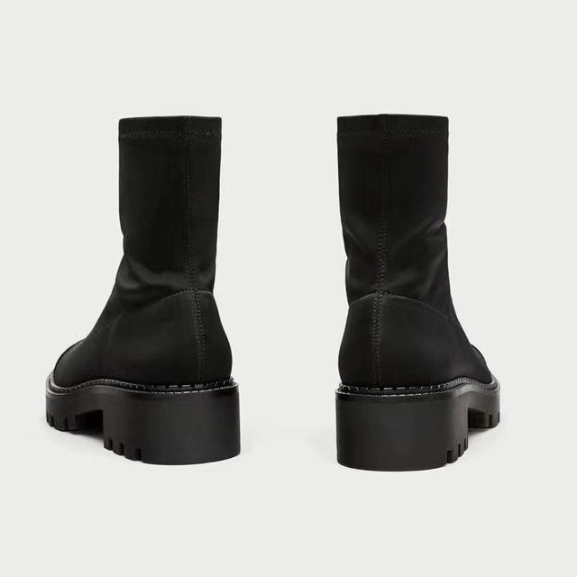 Het ontwerp combineert een elastische, bij de enkel passende schacht met een stevige platformvoet. De structuur omsluit de voet met strakke lijnen en discrete verstevigingen en zorgt voor stabiliteit en ondersteuning tijdens het dragen. De verhoogde zool heeft uitgesproken tractie en een functioneel profiel dat is ontworpen voor stadswandelen.
