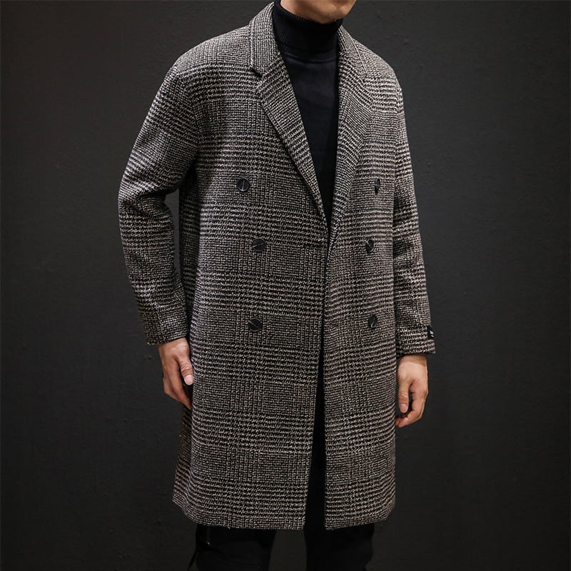 Deze jas heeft een zacht oppervlak dat goed werkt op koelere dagen en biedt een evenwichtige aanwezigheid die natuurlijk past bij stedelijke routines. Het ontwerp heeft een traditioneel patroon dat ingetogen is zonder overdreven te zijn, terwijl het lange silhouet een strakke lijn behoudt voor praktisch en comfortabel dragen op verschillende momenten van de dag.