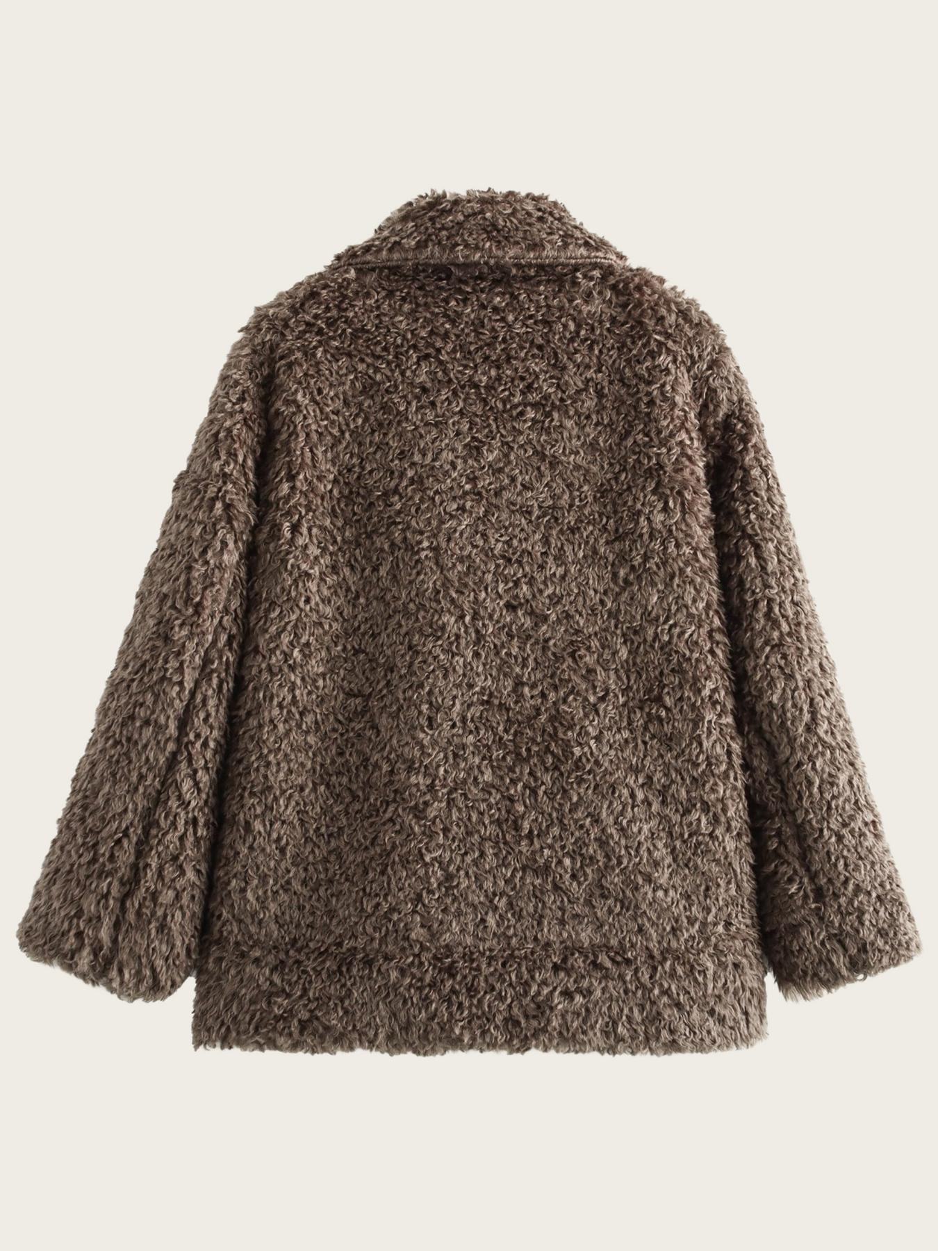 Deze pluche jas combineert zachtheid en stijl om je wintergarderobe te verbeteren. De pluizige textuur biedt een behaaglijk gevoel dat beschermt tegen de kou en zorgt voor een geraffineerd en knus gevoel.