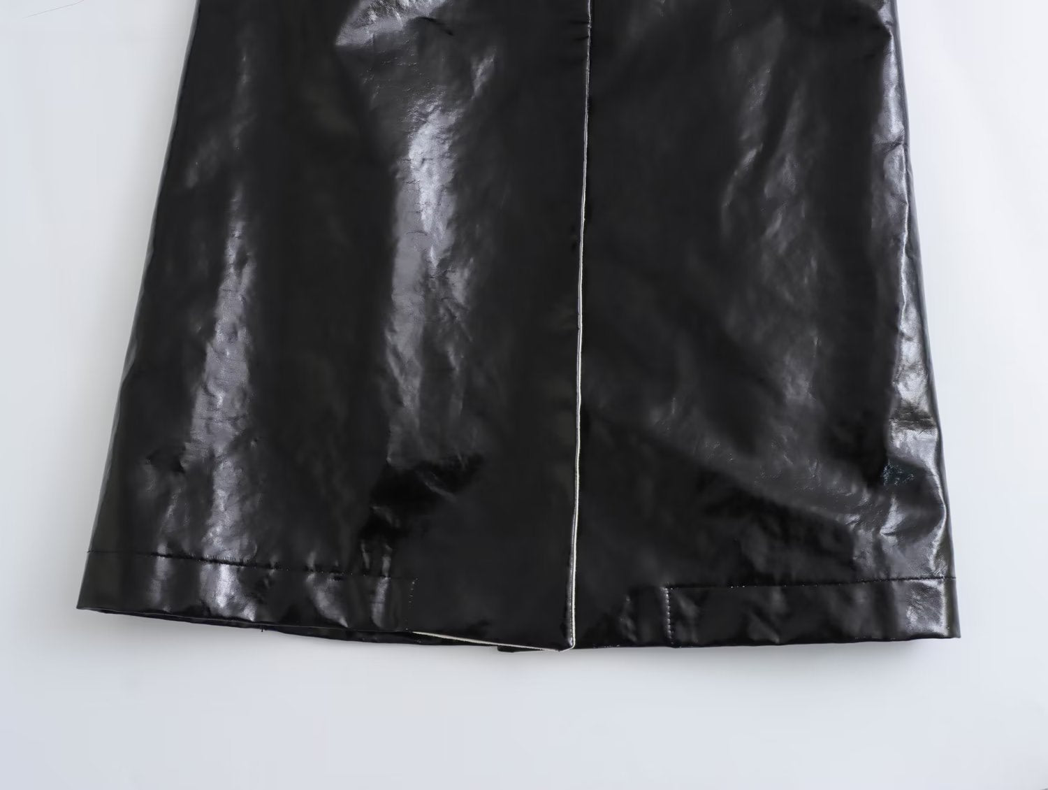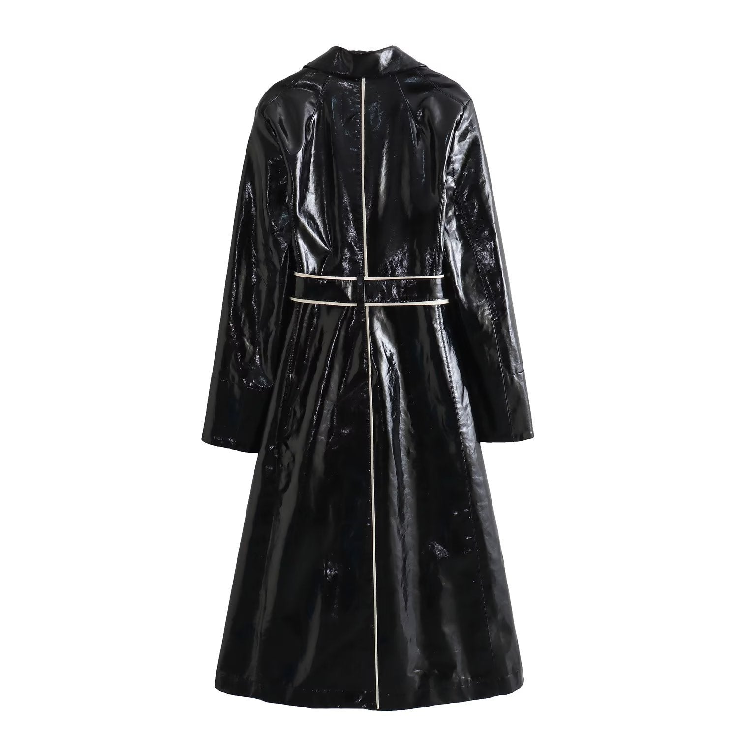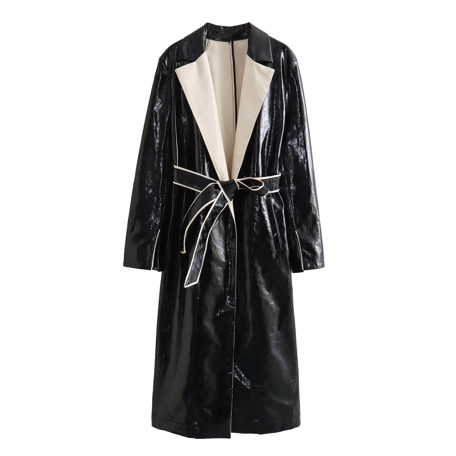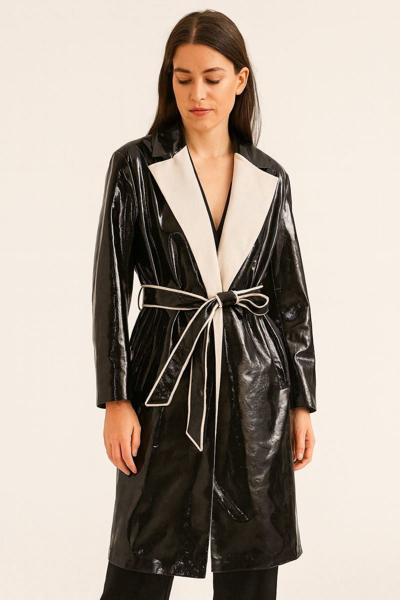 Deze jas heeft een langgerekt, vloeiend silhouet dat aanwezigheid toevoegt zonder stijfheid, ontworpen om op te vallen in het koude seizoen met een eigentijdse aanpak. De brede revers creëren een gestructureerde omlijsting aan de bovenkant, terwijl de glanzende afwerking een scherp, elegant visueel contrast toevoegt. Dankzij de ceintuur sluit het kledingstuk nauw aan op het lichaam, waardoor de vorm wordt aangepast aan de gewenste stijl en het ensemble in balans wordt gebracht.