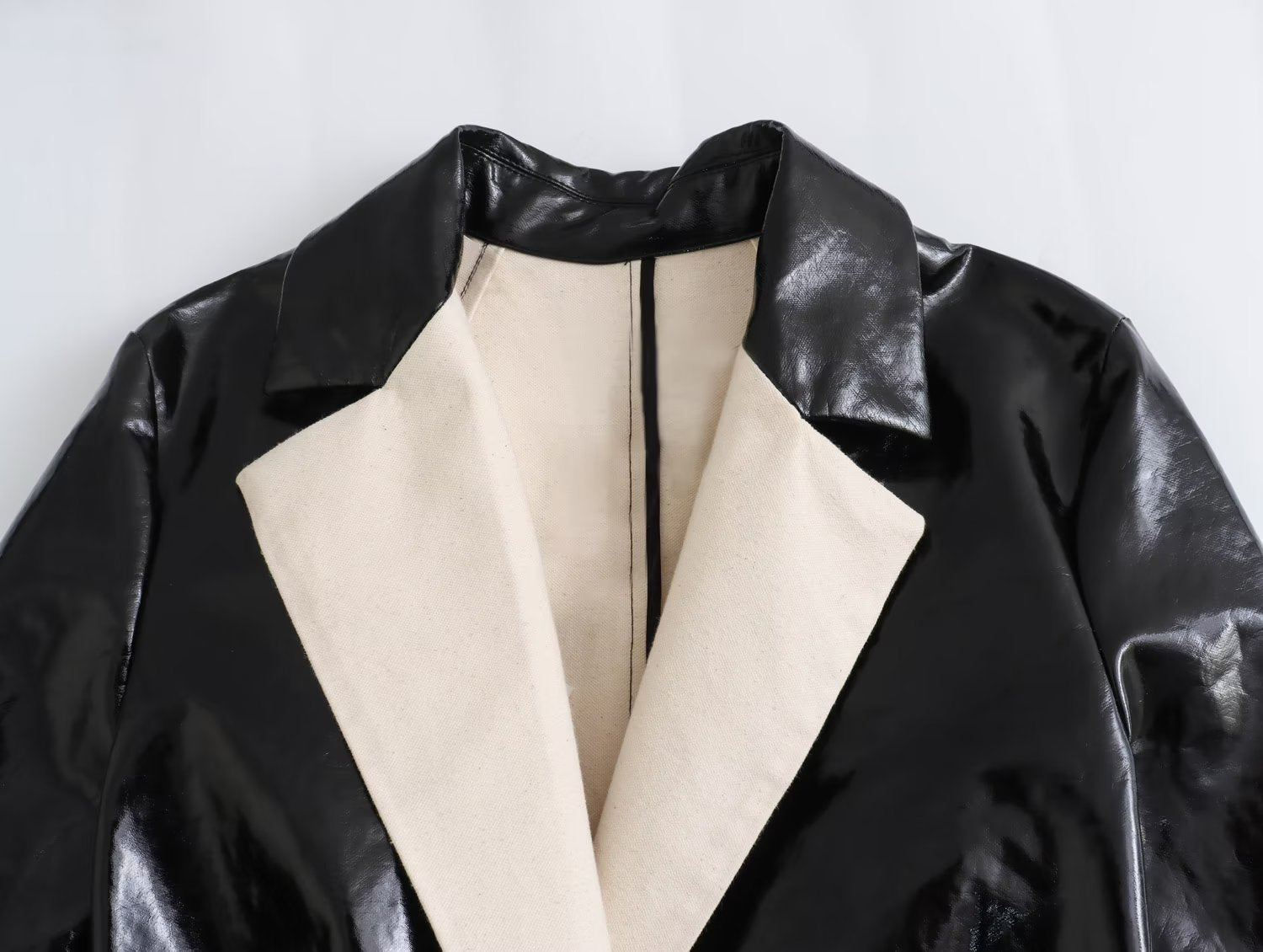 - Detail: brede revers en strakke lijnen