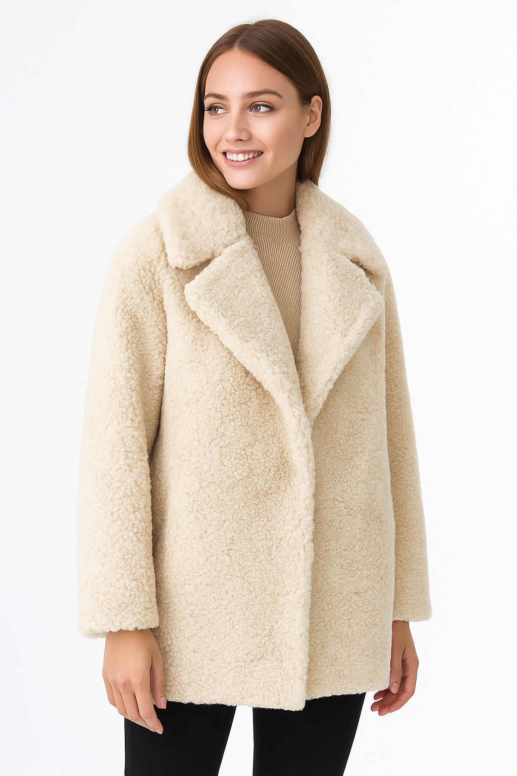 Deze jas heeft een zachte, omhullende textuur die bij aanraking meteen een warm gevoel geeft. Het pluizige oppervlak creëert een lichtgewicht volume dat koude dagen kan doorstaan, terwijl het een ontspannen, eigentijdse esthetiek behoudt. Het korte silhouet vergemakkelijkt het bewegen en zorgt ervoor dat je het kunt combineren met verschillende kledingstukken zonder comfort te verliezen.