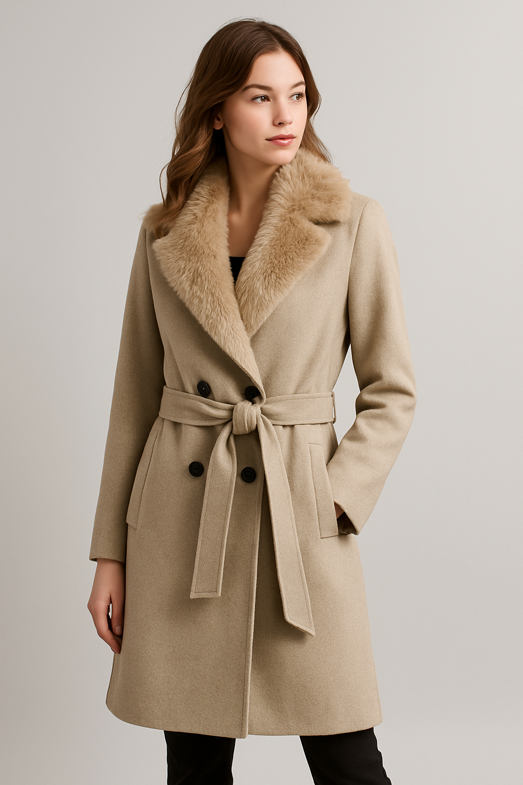 Deze jas heeft een ontwerp dat een klassiek silhouet combineert met een zachte textuur die ideaal is voor koude dagen. De pluche kraag biedt een omhullend gevoel vanaf de eerste aanraking, terwijl de riem je in staat stelt de vorm op natuurlijke wijze aan te passen zonder comfort te verliezen.