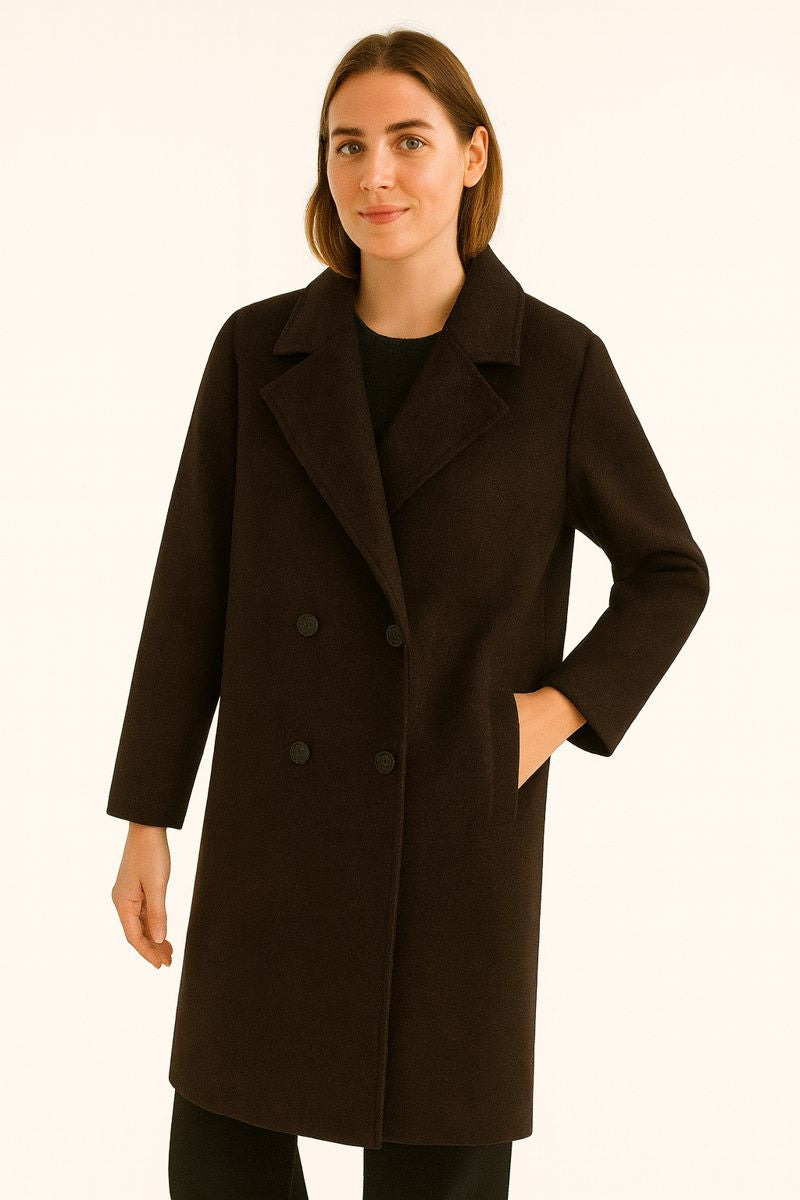 Deze jas heeft een nette constructie die aanwezigheid en comfort combineert tijdens het koude seizoen. Het rechte silhouet zorgt voor een strakke drapering die het lichaam volgt zonder stijfheid, terwijl de gekruiste sluiting zorgt voor een omhullend, goed gedefinieerd gevoel. De brede revers versterken het tijdloze karakter van het kledingstuk, waardoor een ontwerp ontstaat dat netjes aanvoelt en gemakkelijk te integreren is in het dagelijkse leven.