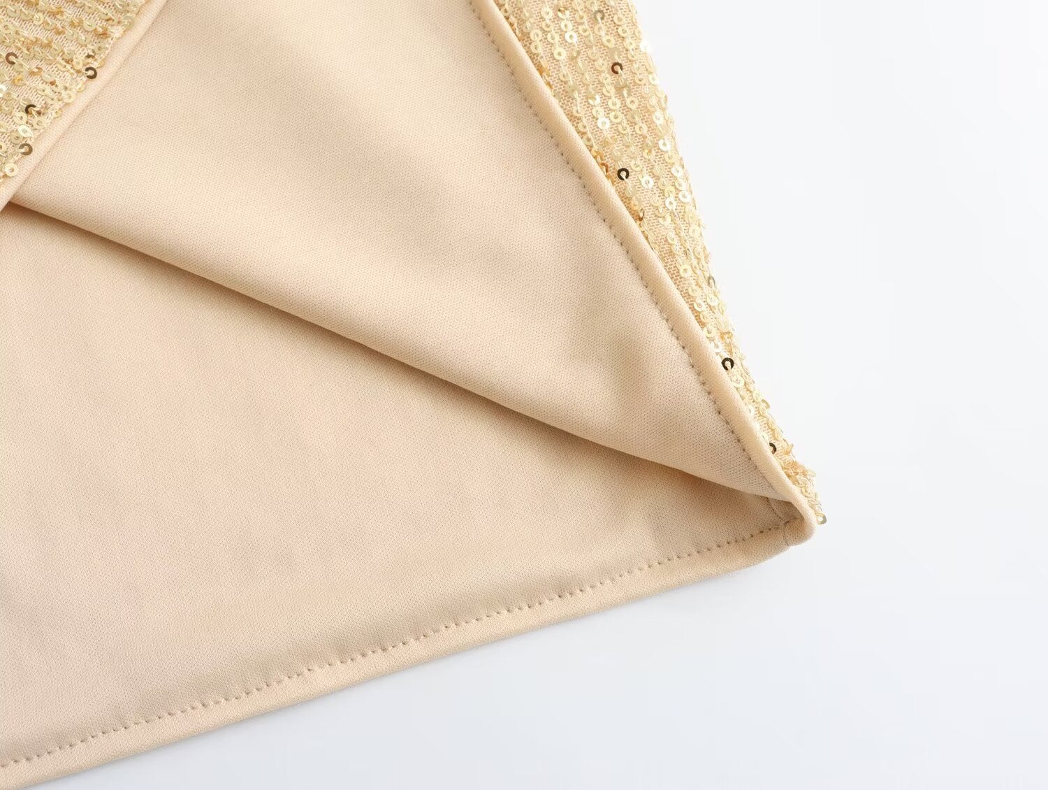 Deze jurk biedt een eenvoudige en eigentijdse manier om pailletten te dragen, met een strakke esthetiek die zeer geschikt is voor seizoensfeesten. Het rechte, kort gesneden ontwerp geeft een moderne look zonder overdreven te zijn, terwijl het licht glinsterende oppervlak een lichtgevend effect creëert dat geschikt is voor evenementen zoals feestelijke diners of eindejaarsborrels. De mouwloze structuur zorgt voor bewegingsvrijheid en maakt het mogelijk om het te combineren met lichte lagen wanneer dat nodig is.