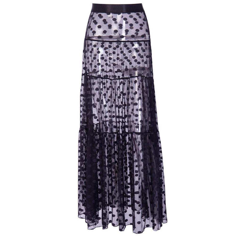 Deze lange rok van transparante tule met stippenprint is ontworpen om op te vallen in zomerse omgevingen en biedt een lichte en verfijnde stijl. Het vloeiende model en de hoge taille maken het silhouet slanker, terwijl de transparante stof een gedurfde touch toevoegt die ideaal is om over zwemkleding of strandkleding te dragen. Een chique en veelzijdige keuze voor resortlooks of kustuitstapjes.