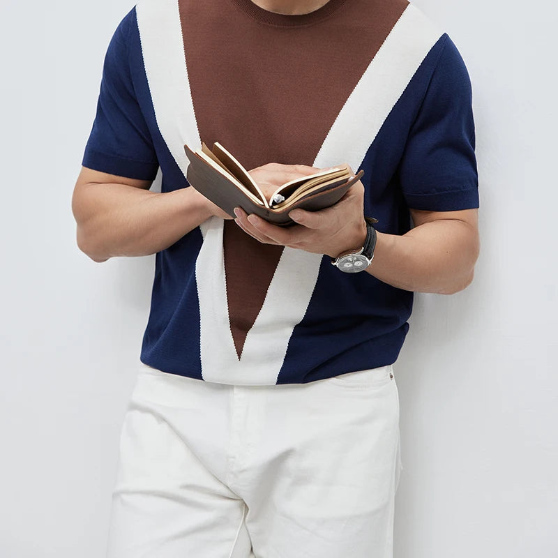 Dit T-shirt is gemaakt van een zachte, hoogwaardige acetaatmix en biedt een lichtgewicht, koele en elastische textuur die natuurlijk op het lichaam zit. Het geometrische kleurblokpatroon voegt een eigentijds en geraffineerd accent toe.