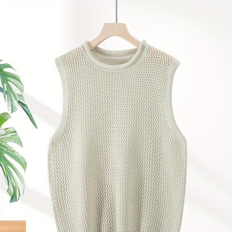 Een kledingstuk dat van de basics een stijlstatement maakt. Dit mouwloze gilet voor heren is gemaakt van een lichtgewicht opengewerkt breisel en biedt een eigentijds ontwerp dat stoer en karaktervol in balans brengt.