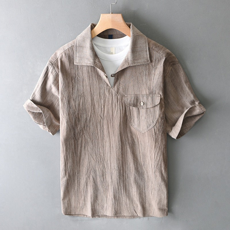 Het ontwerp heeft een open Cubaanse kraag, een functionele zak met knopen aan de voorkant en een ontspannen pasvorm die vrij valt. Zachte plooien in de stof geven een casual vintage afwerking, perfect voor wie waarde hecht aan een moeiteloze stijl.